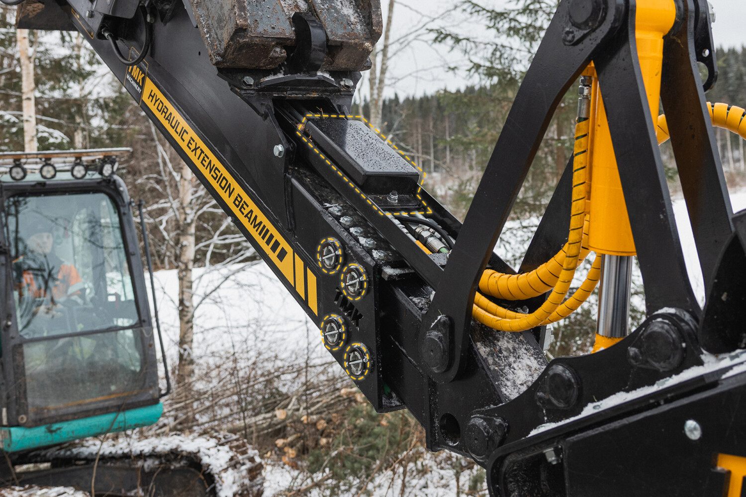 The hydraulic and electric components are now hidden under housings so they are better protected, without making them hard to access, which makes them easier to service and trouble shoot. The hydraulic lines are now shorter (=more optimized) and components that see a lot of wear are easier to fix or replace even in the forest. Extensions sliding bits are now very easily adjustable, so you can have a quiet, smooth operating extension all the time.