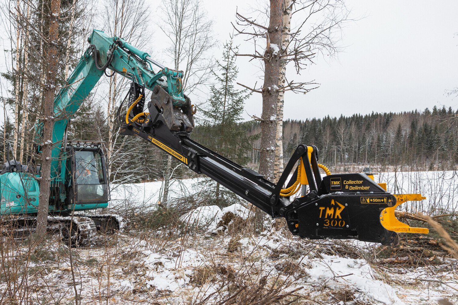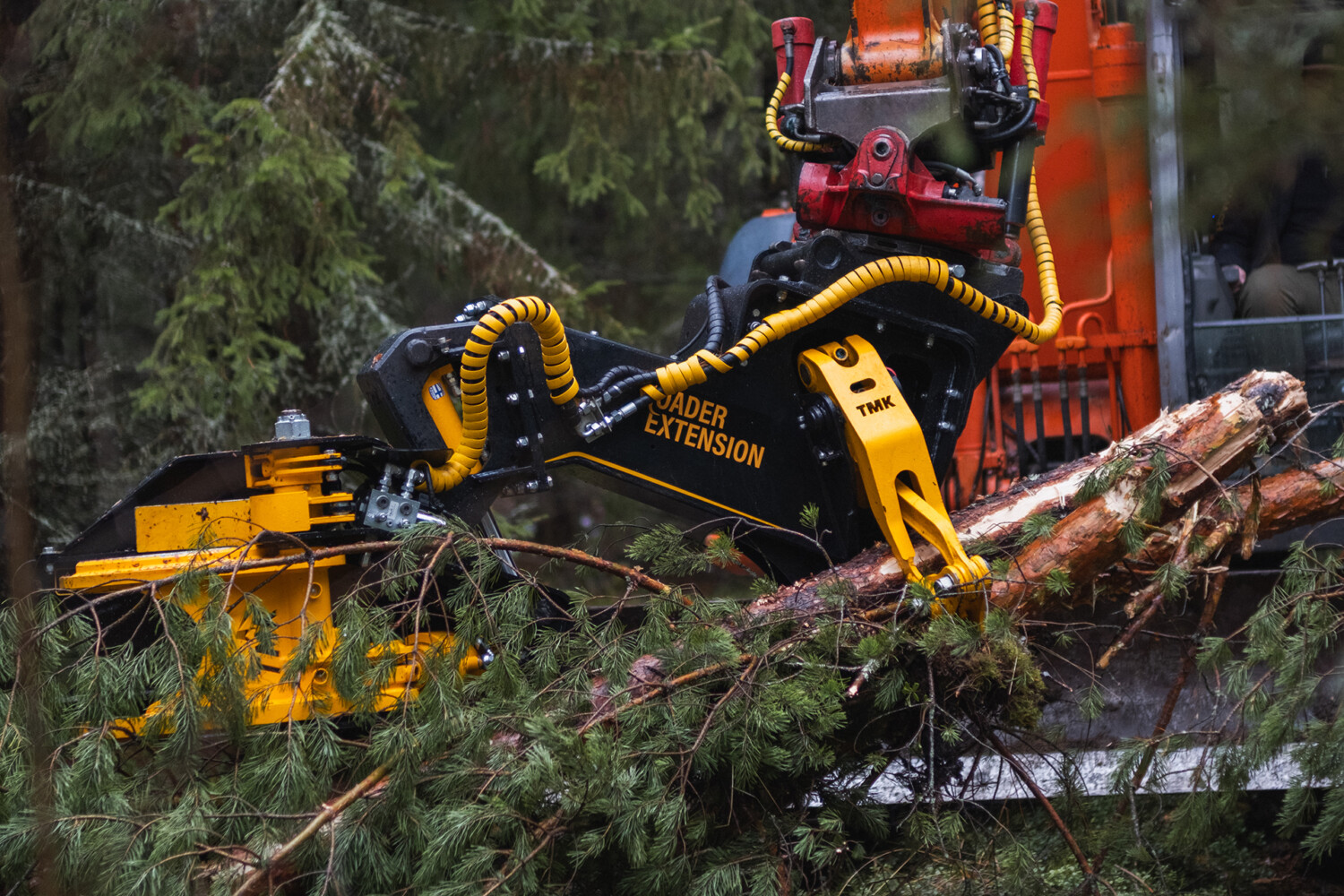 The Loader Extension with tilt is very efficient when used with a tiltrotator as you don't have to use the excavators cylinders as much. With a tiltrotator you can make tree stacks on the sides of the excavator as you can rotate the extension to the side and drop the trees with a tilt. The tilt also makes it possible to delimb and cut trees even higher than before as it gives you more effective reach.