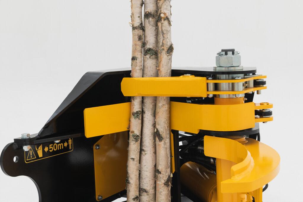 The Collector makes cutting trees and moving them much more efficient. The Collector takes hold of the cut wood, so the grapple is released, and it allows another tree to be cut. This can be repeated until the tree shear is full and several trees can be lowered to the ground at a time. The Collector therefore considerably reduces the need to move the boom and the machine, when several trees can be caught before they are dropped.