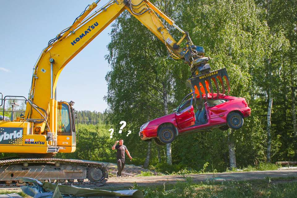 Now we've probably all been in this situation, you are just doing your work and out of nowhere comes a guy that is in such a hurry. No problem for the TMK MultiGrab, just lift the car to the other side of the excavator and on we go.
