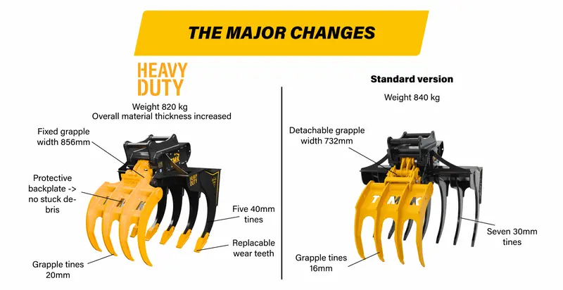 Stronger materials - thicker hardox plates used overall for the frame and grapple)