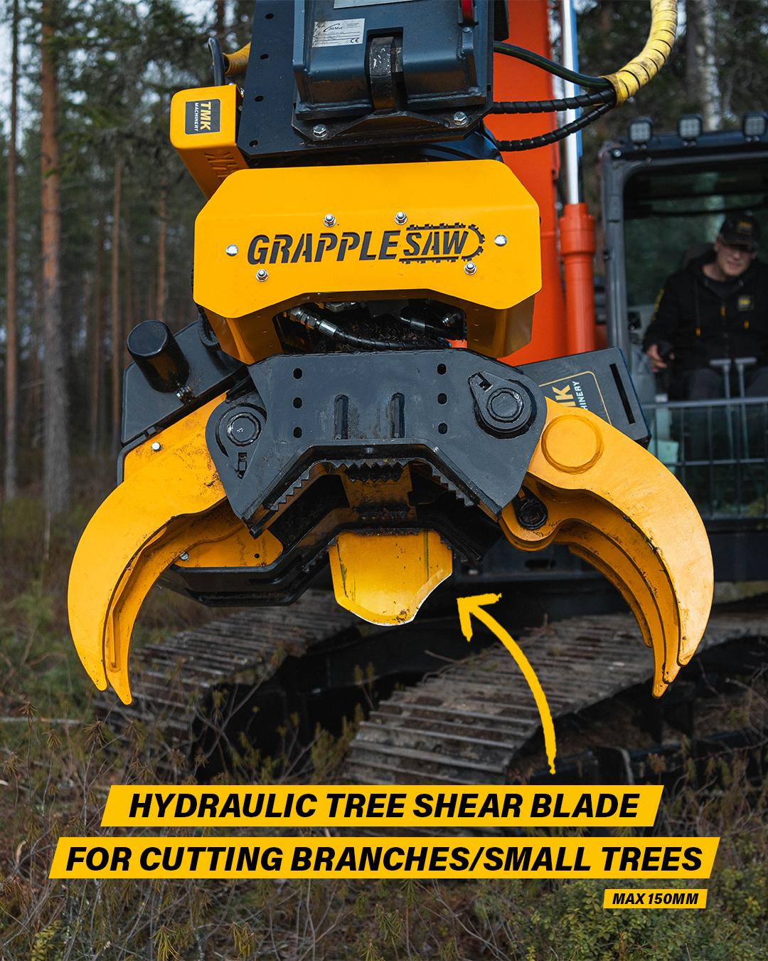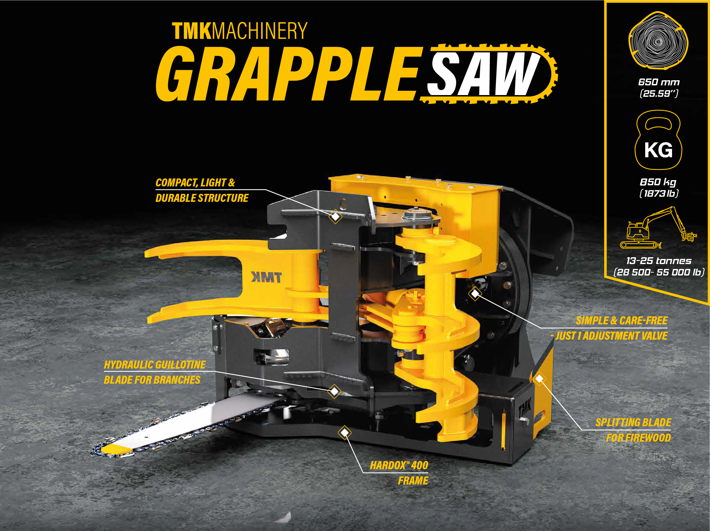 The aim of the design team was to make an affordable and small grapple saw, that can still cut larger trees. What we came up with is a compact, efficient and diverse excavator attachment that features 3 different cutting motions (saw, hydraulically controlled tree shear blade, splitting blade), dual grapple arms, optional 360 Rotator and a whopping 650mm cutting capacity (10 cm more than originally planned!). And as always with TMK products, everything is controllable with just 1 DA-line, (with a little twist as the grapple saw requires also the drain line to ensure reliable operation).