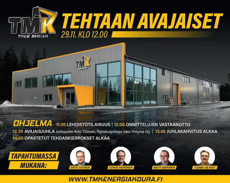 The Grand Opening of the TMK factory will be celebrated on Friday, November 29, 2019. The factory doors are opened at 12h and the actual opening ceremony will begin at 12:30. Building project began in March, and since then there has been Factory project updates in social media. Next week's Factory Project update is the 17th and the final one. Check out the videos on TMK Tree shear Facebook or Youtube! However, the picture never beats reality, so next Friday you can experience the TMK factory live in Hankasalmi: Welcome!