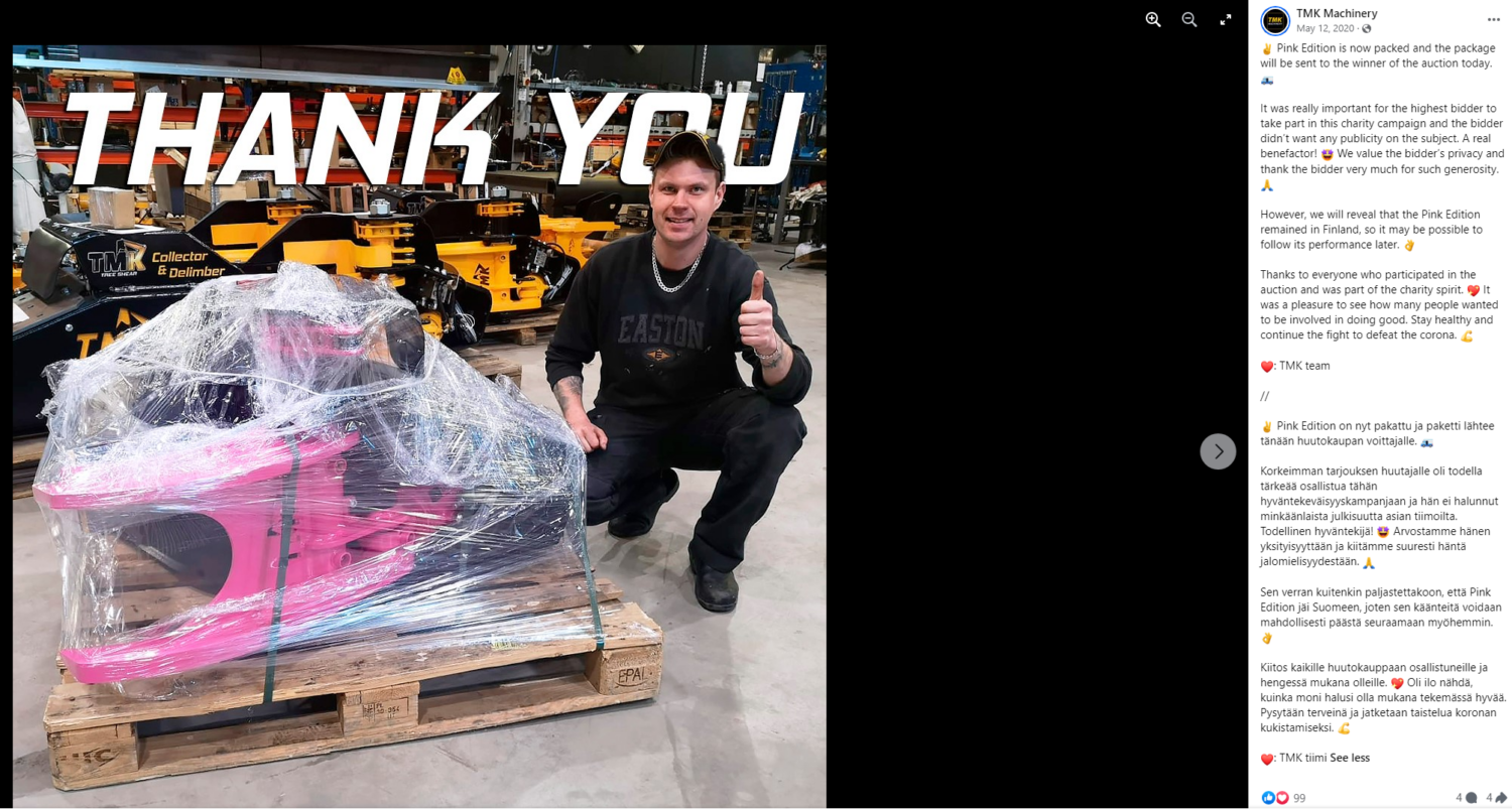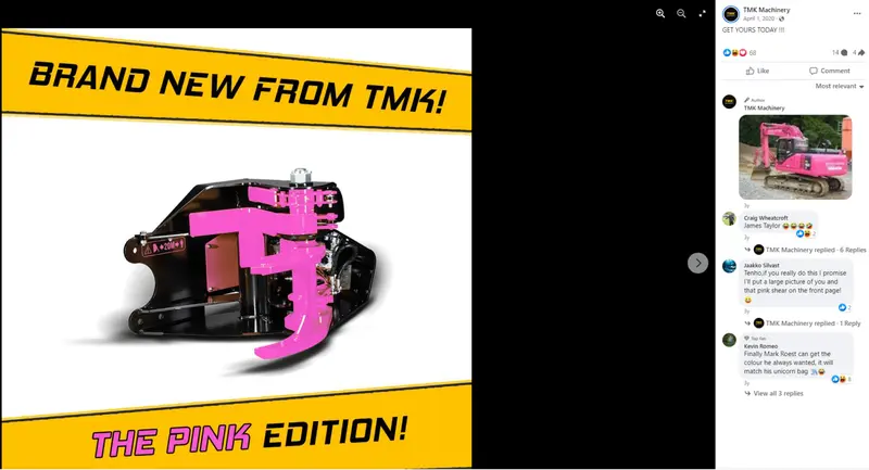 Okay, It all started just as the Covid-19 had put Finland into shutdown. We posted a photoshopped picture of our TMK 300 shear in which it was turned into black and pink as an april's fools joke to Facebook (you can see the original post here) and Instagram. And what followed was nothing we could have expected. So many people got excited and expressed their interest for a pink TMK Tree Shear.