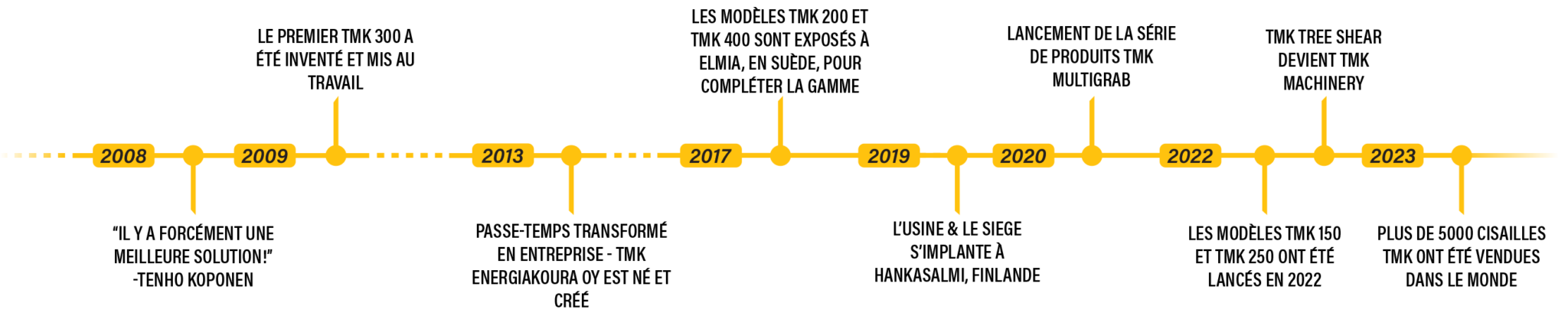 TMK Machinery est une entreprise familiale finlandaise qui propose des accessoires efficaces pour tous vos ouvrages. Au fil des ans, nombreux sont ceux à penser que les cisailles forestières de TMK Machinery étaient le bon choix pour la tâche qu’ils avaient à accomplir. Grâce à l’élargissement de la gamme de produits avec TMK MultiGrab, la demande s’est encore accrue. Le réseau de distributeurs de TMK Machinery couvre plus de 30 pays du monde entier. TMK innove et développe en permanence de nouveaux produits pour répondre aux besoins des utilisateurs. Tous les produits TMK sont conçus et fabriqués en Finlande dans des matériaux de haute qualité.