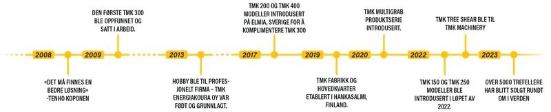 TMK Machinery er et finsk familieeid selskap som tilbyr effektive tilbehør for dine entreprenørbehov. Gjennom årene har mange funnet TMK Machinerys treklippere til å være et pålitelig valg for deres arbeid. Med utvidelsen av produktutvalget med TMK MultiGrab, har etterspørselen økt enda mer. TMK Machinerys distributørnettverk dekker mer enn 30 land over hele verden. Nye produkter blir kontinuerlig innovert og utviklet hos TMK for å møte brukerens krav. Alle TMK-produkter er designet og produsert i Finland av materialer av høy kvalitet.