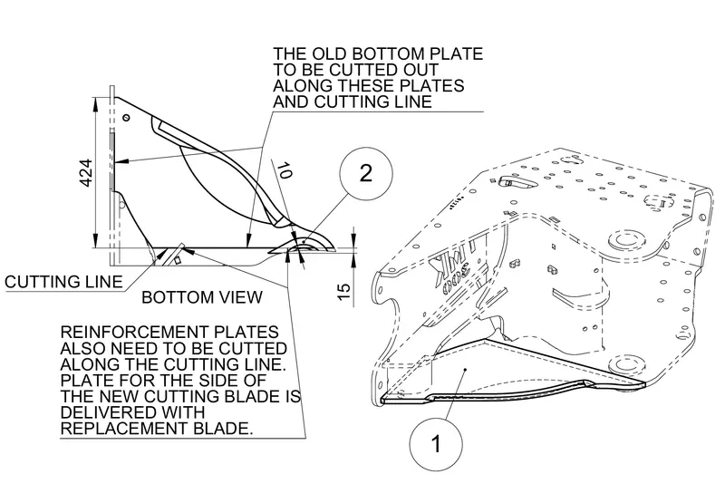 Cut out the old blade and reinforcement plates along the cutting line
