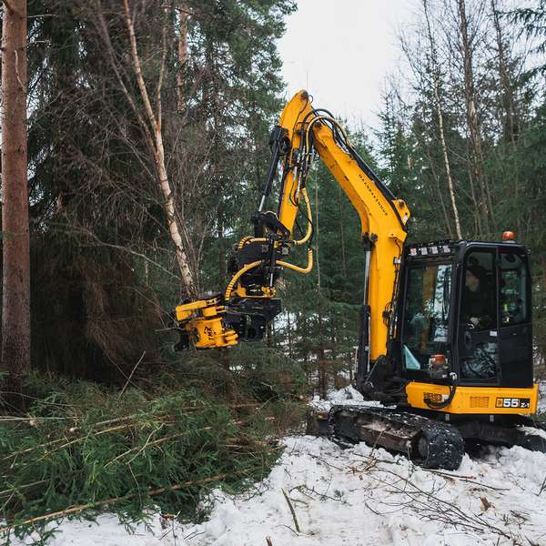 A Tree Shear is a hydraulic attachment meant for cutting trees like a guillotine. They are mainly used for tree removal where the other alternative methods include manual work with a chainsaw or a brush cutter, or machines equipped with a grapple saw or mulcher.
